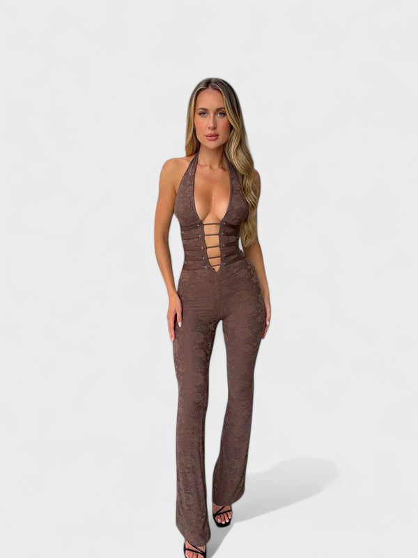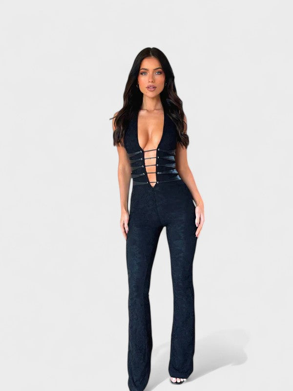 Este vestido foi feito para mulheres que não têm medo de destacar-se. Com um decote profundo e detalhe frontal em tiras, este design sexy e sofisticado valoriza a silhueta com elegância e confiança. O tecido com leve textura floral acrescenta um toque de classe ao visual arrojado, tornando-o ideal para noites especiais, festas ou eventos onde queres brilhar.