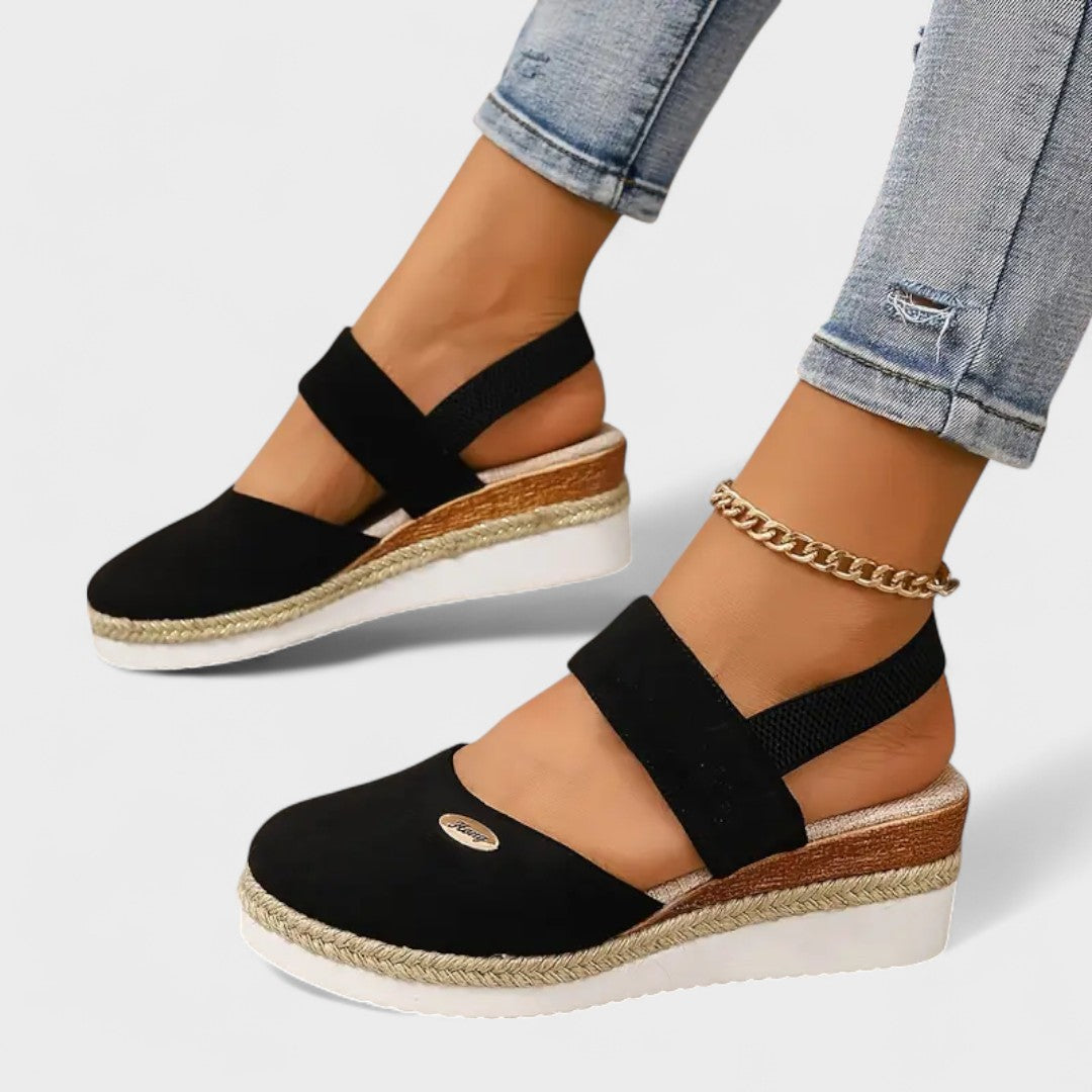 Estas sandálias com cunha são o equilíbrio perfeito entre conforto e estilo. Com design moderno e feminino, oferecem uma base estável, elástico para ajuste prático e uma palmilha macia que acompanha o movimento do pé. O tom nude e os detalhes em juta e cortiça tornam-nas ideais para looks casuais elegantes — desde passeios ao fim de semana até eventos ao ar livre.